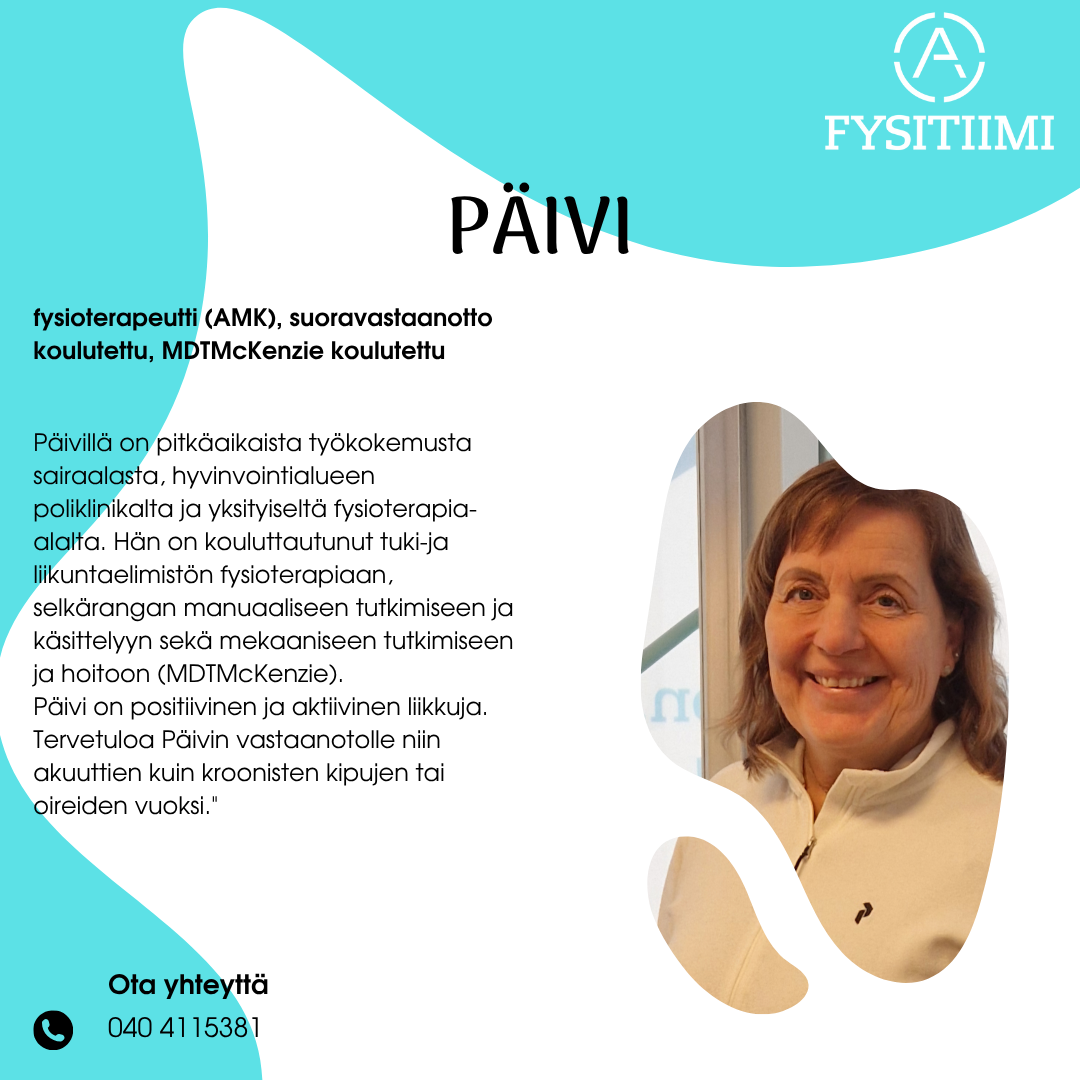 Fysioterapian aikana kipusi vähenevät ja kehosi vahvistuu sekä ja motivoidut ylläpitämään toimintakykyäsi!